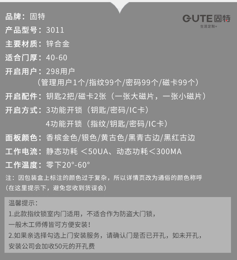 商品名称:固特指纹锁家用防盗门锁室内木门智能锁密码锁电子锁办公室房间门