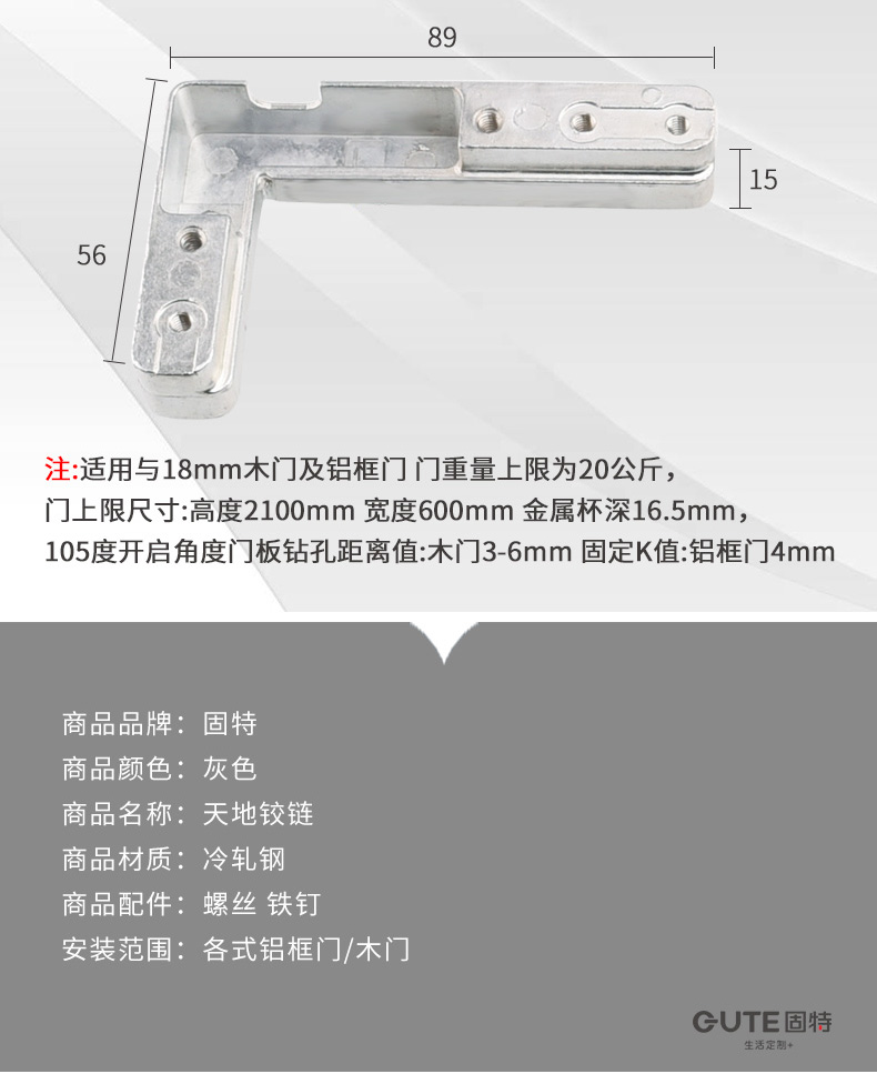 商品名称:固特天地铰链隐藏合页铝框木门高柜门重型门调节液压缓冲一付价