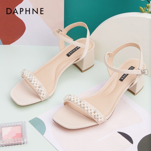 达芙妮2020夏季新款女鞋优雅一字带柔美方头粗跟防滑凉鞋吸晴珍珠