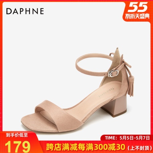 商品名称:达芙妮新款夏一字带凉鞋女优雅流苏简约绒面方头粗跟通勤鞋