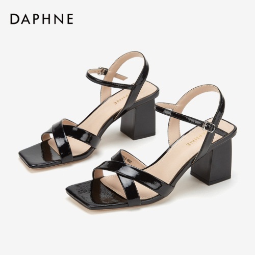 达芙妮2020夏季新款女鞋一字式扣带方头露趾凉鞋交叉绑带粗跟鞋子