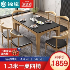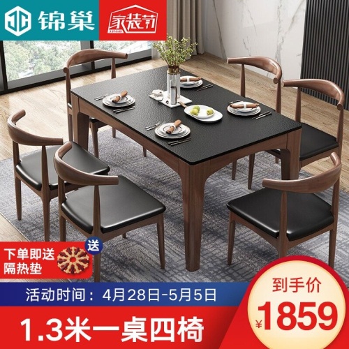 锦巢 餐桌 火烧石实木餐桌 现代简约小户型餐桌椅组合餐厅家具YF2610 胡桃色+牛角椅(无炉) 1.3米一桌4椅