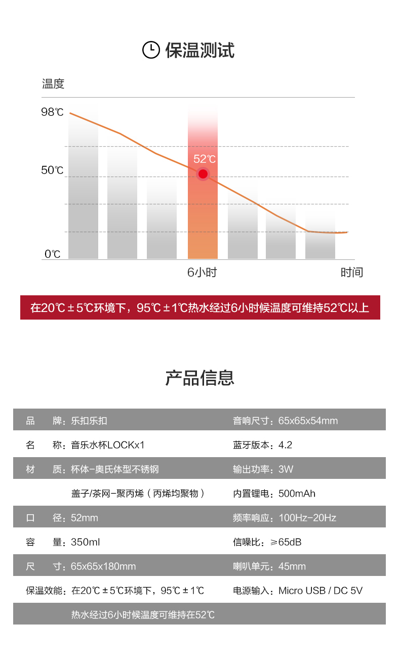 保温性能描述:在20℃±5℃环境下,95℃±1℃热水经过6小时温度可维持在52℃以上
