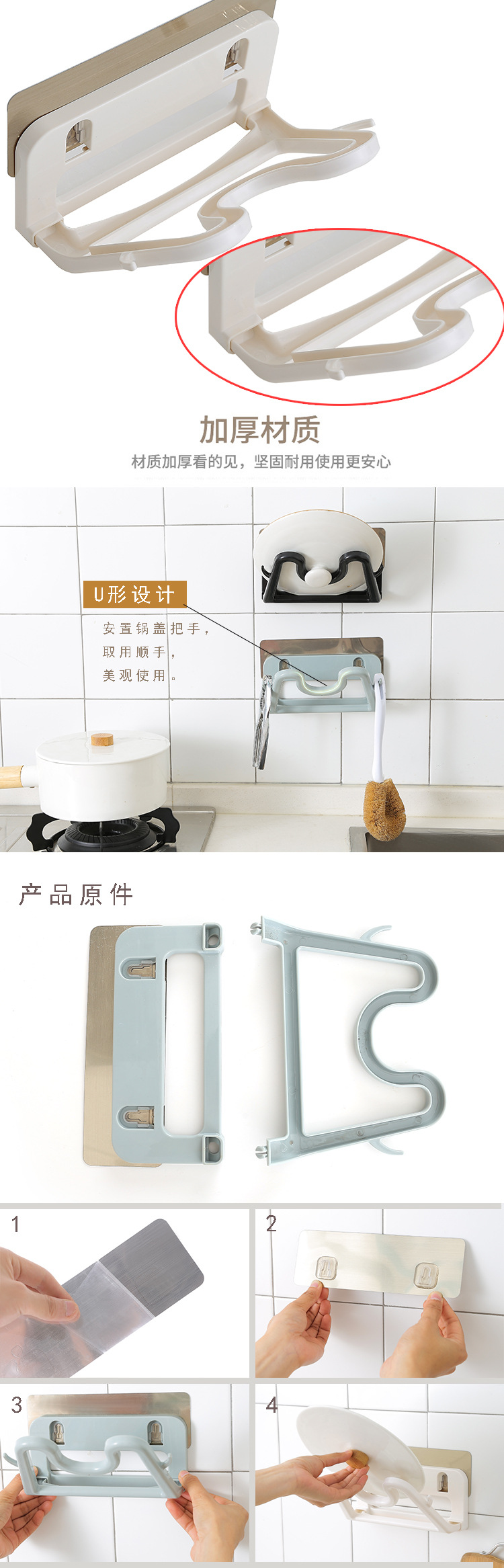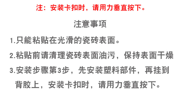 安装步骤如上图:先将胶片贴在墙体表面,注意,尽量劈开瓷砖缝隙,然后将组装好的锅盖架卡入卡槽即可