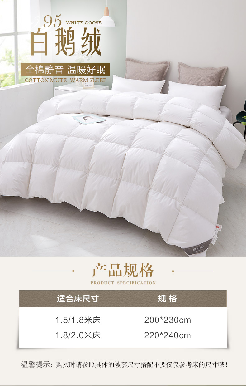 商品名称:博洋羽绒被95白鹅绒被保暖被芯单双人加厚冬季保暖全棉被子鹅绒被