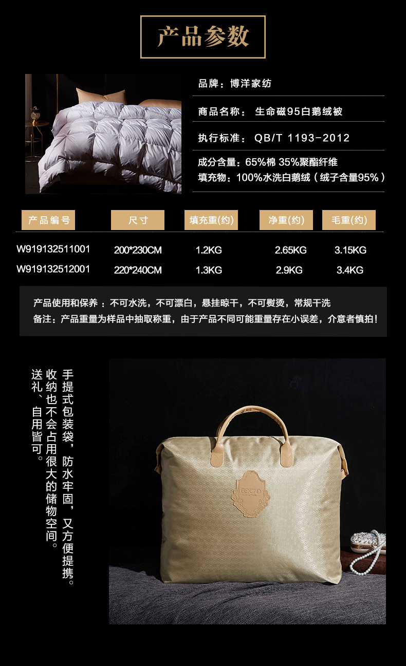 商品名称:博洋家纺羽绒被95白鹅绒冬被保暖加厚防钻绒被芯生命磁冬天被子