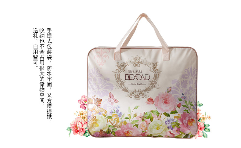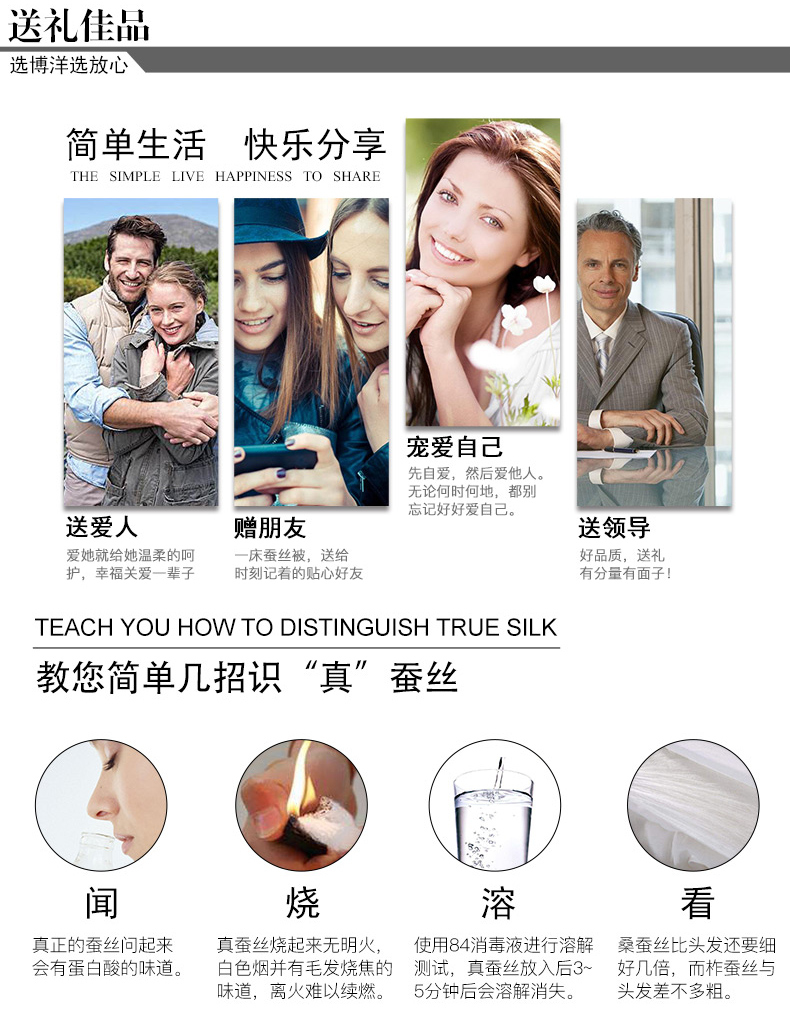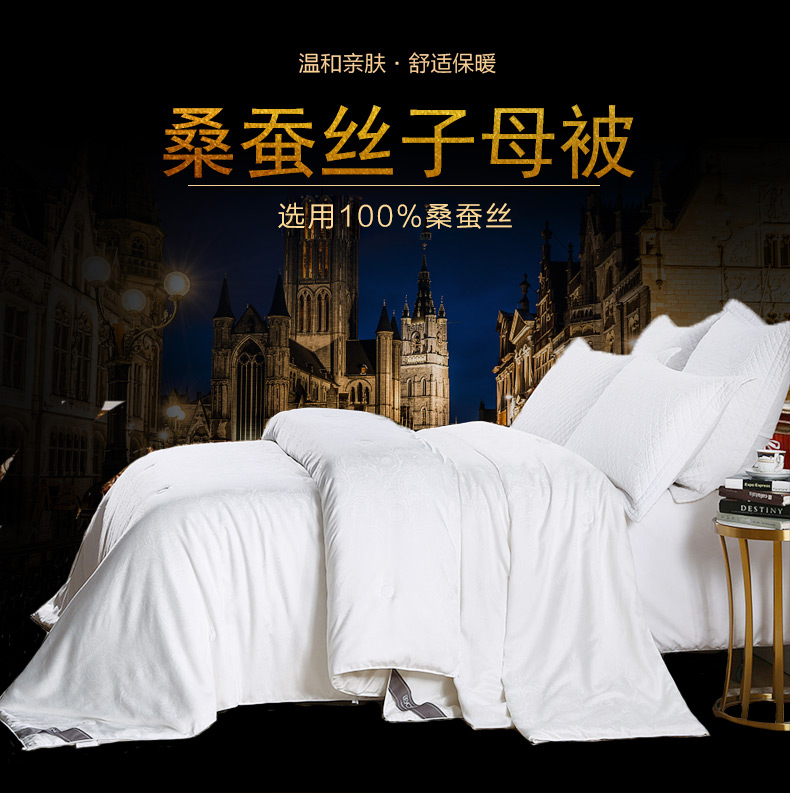 面料成分 :100%聚酯纤维 100%桑蚕丝子母被Ⅱ填充物成分 :100%桑蚕丝(中长丝绵和短丝绵)(含微量其他纤维) 100%桑蚕子母被Ⅲ填充物成分 :100%桑蚕丝(中长丝绵和短丝绵