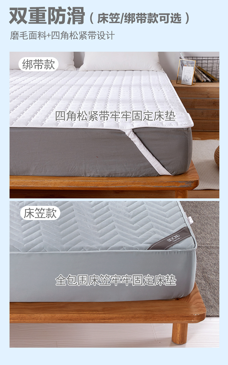 可水洗席梦思保护床垫(床笠款):面料:100%聚酯纤维 填充物:100%聚酯纤维 1.5米床:净重约1kg 1.8米床:净重约1.19kg | ||||