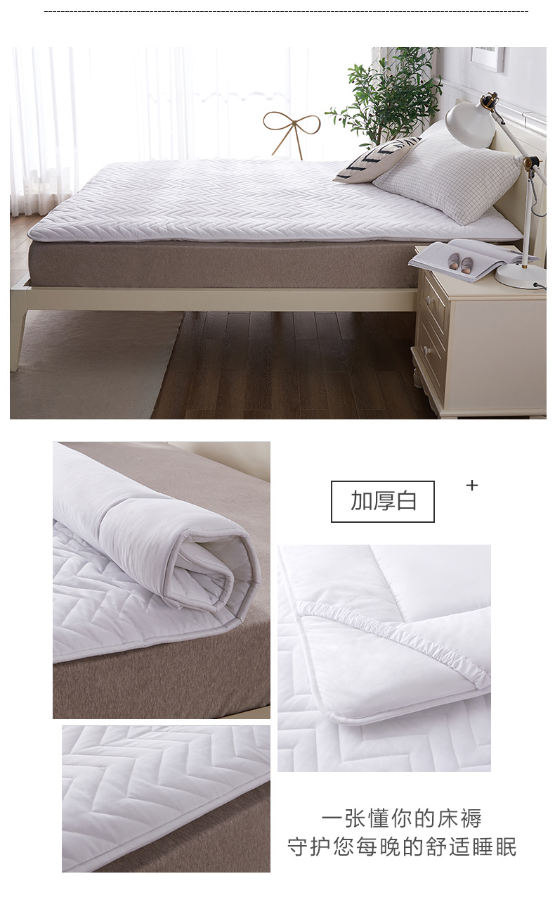 | 温 馨 提 示 | 床褥可以比床垫小几厘米,原因是能够更紧凑的与床垫结合,不至于把铺在上面的床单撑开,影响美观。床褥不宜洗涤。如不慎将液体溅落在产品上请立即用干布或柔软的纸巾吸干液体;如液体对产品造成污染,请用中性洗涤剂以温水轻揉擦拭污染部位,再以清水洗净,挤干水后移至通风处晾干。切忌搓揉或扭拧。备注:产品重量为样品中抽取称重,由于产品不同重量存在小误差,介意者慎拍! | |||