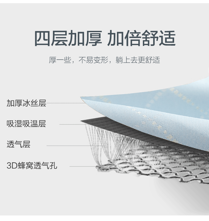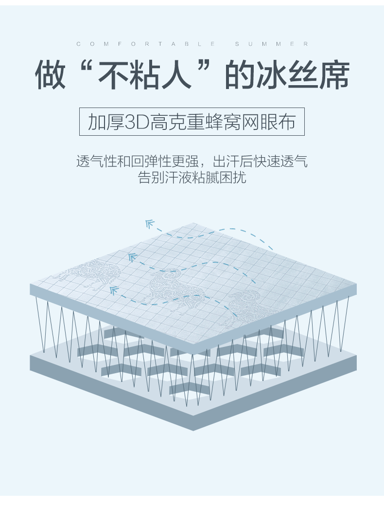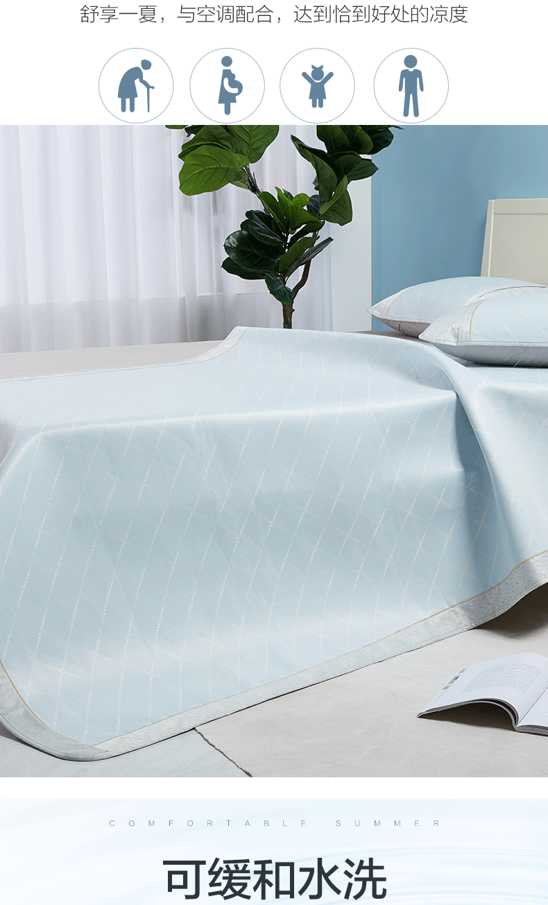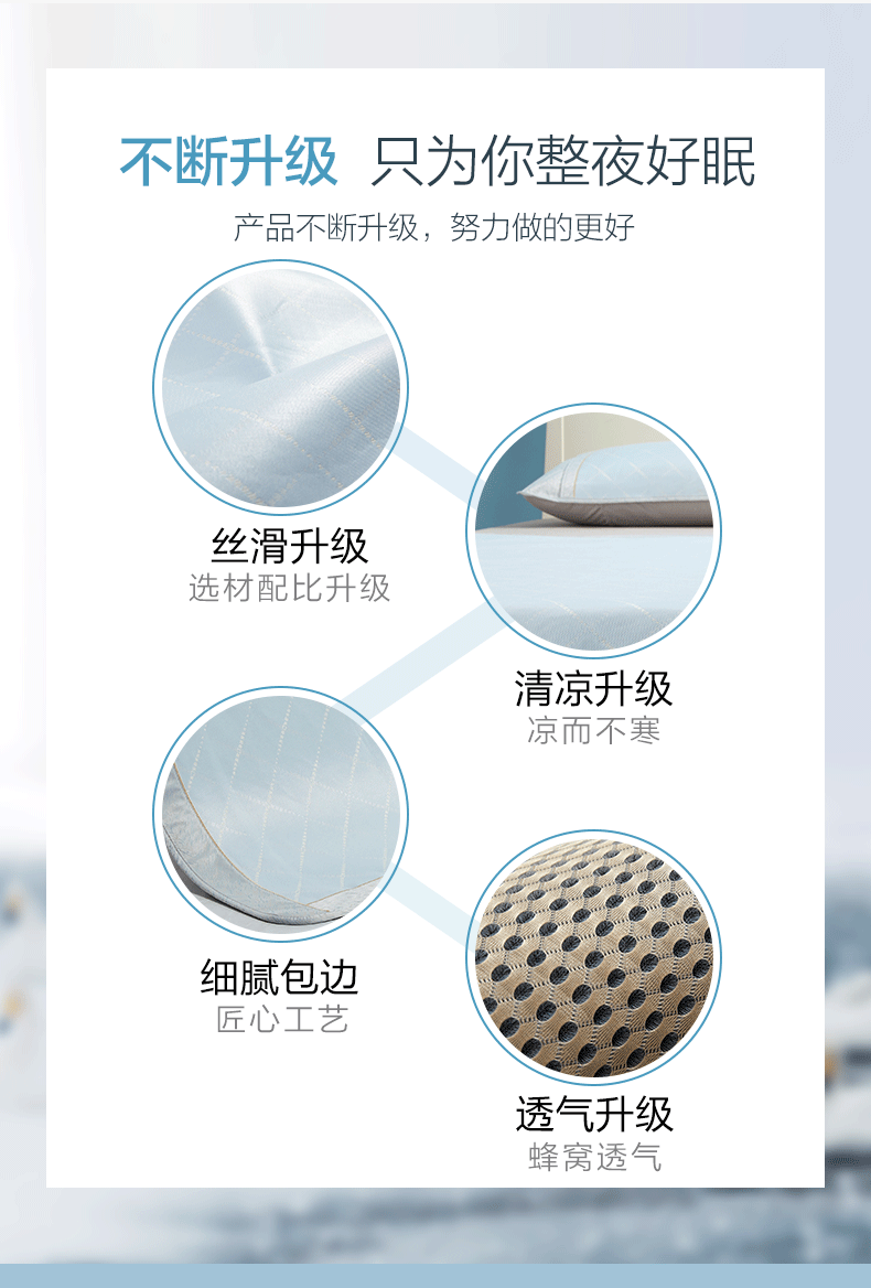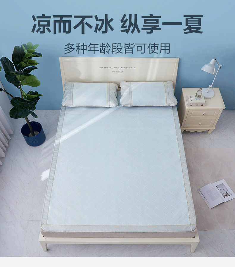 | 使用和保养 | 洗涤方式:本产品适于湿布擦洗,透风阴干。不可水洗,不可拧干,不可曝晒。使用前请用温湿毛巾将正反面擦拭干净,晾干后再使用,使用期间要经常擦拭,保持席面清洁光滑。 | ||