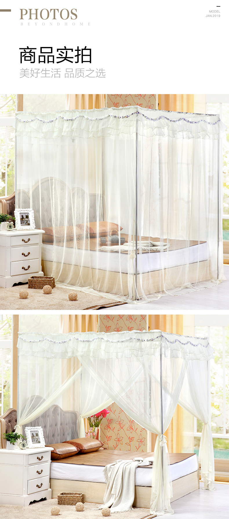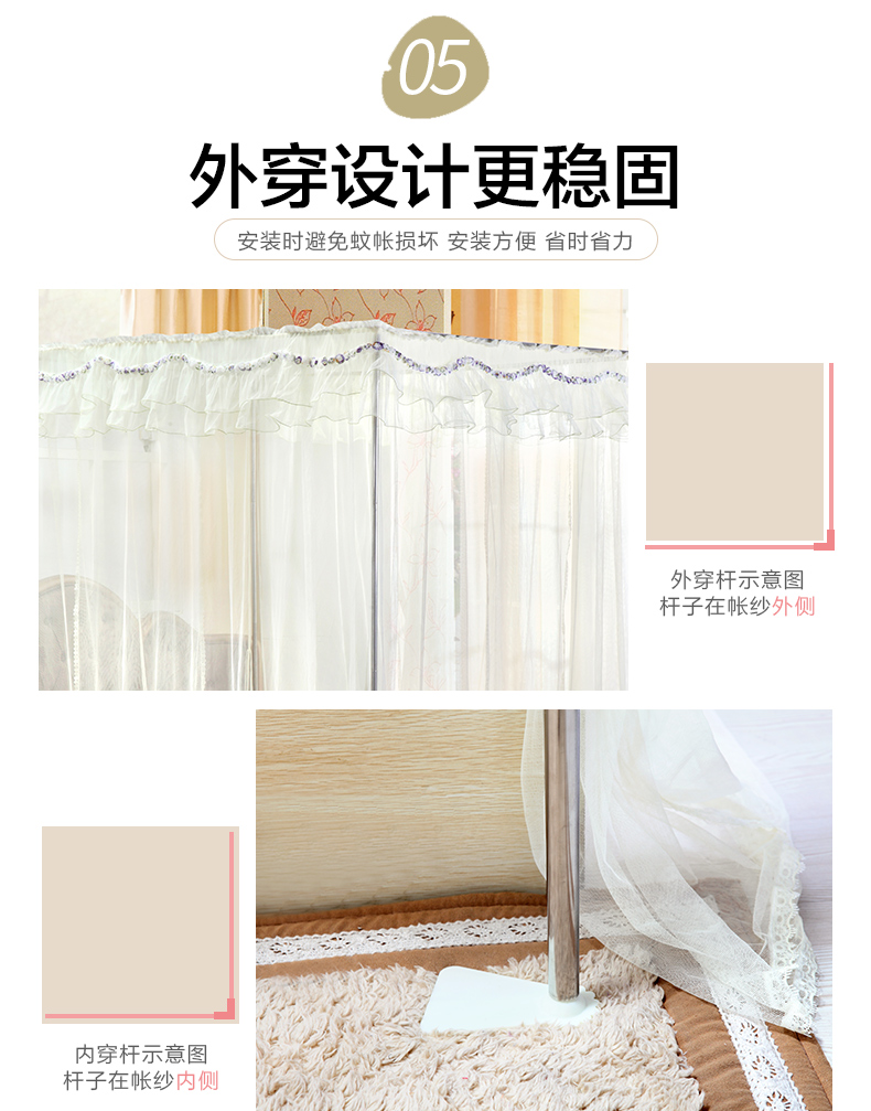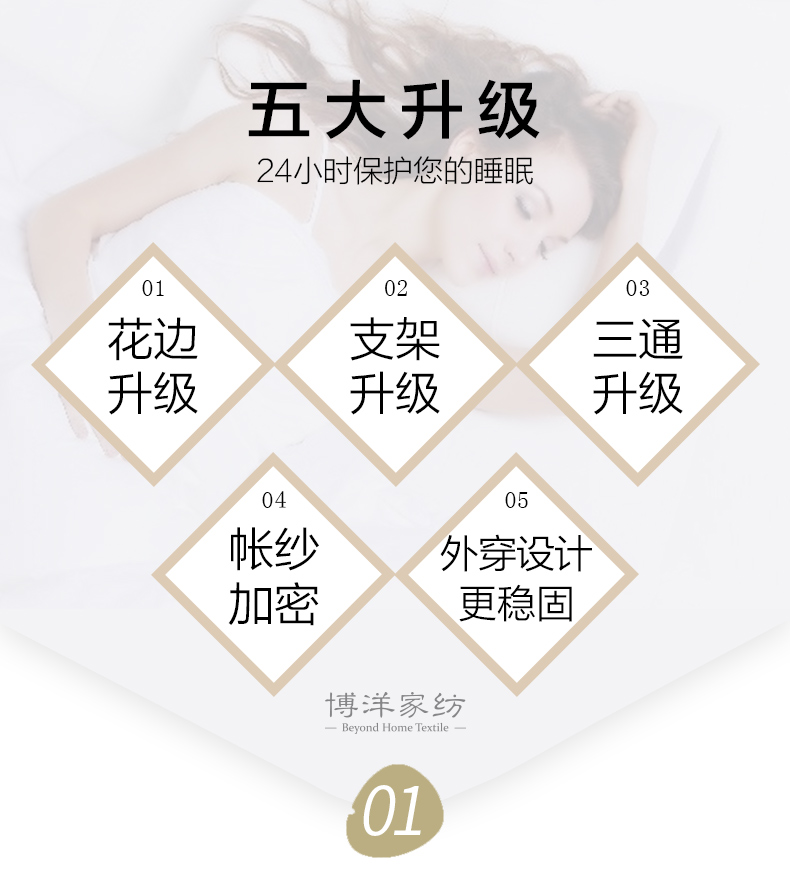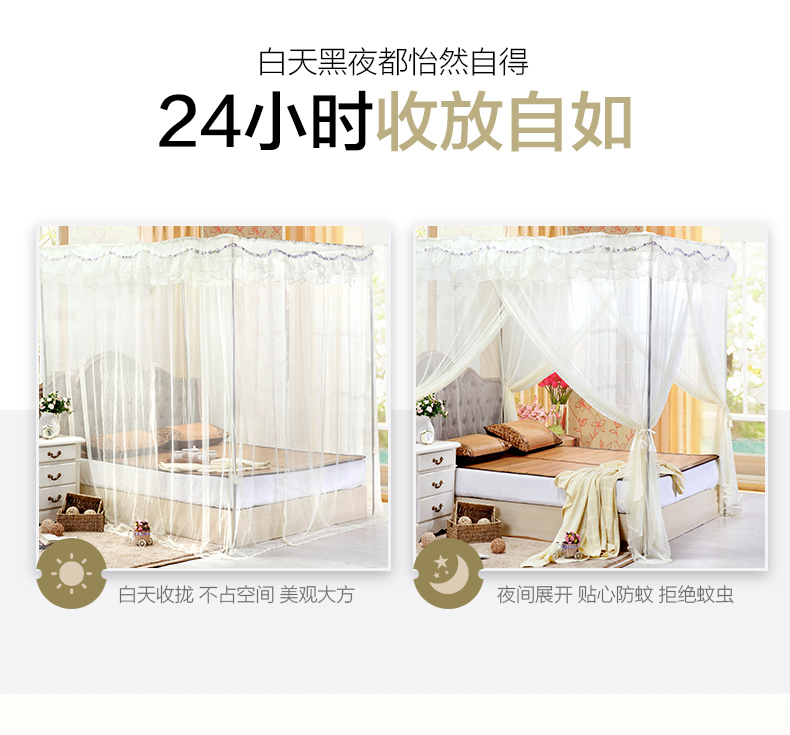 产 品 重 量 | 安娜公主优雅落地帐:1.5米净重3.0kg左右,毛重3.15kg左右 庄园之梦优雅方顶帐:1.5米净重2.87kg左右,毛重2.97kg左右 | ||