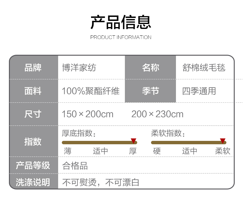 产 品 重 量 | 150*200cm净重1.5kg左右,毛重1.52kg左右; 180*200cm净重1.98kg左右,毛重2.0kg左右 200*230cm净重2.3kg左右,毛重2.32kg左右 | |||