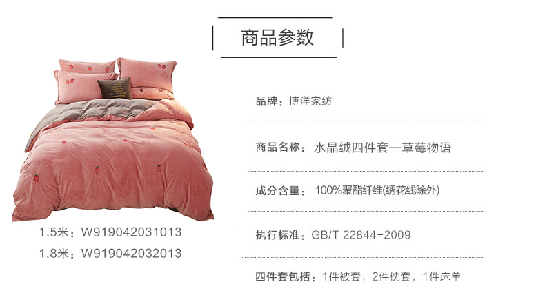 商品名称:博洋冬季珊瑚绒四件套草莓刺绣加厚法兰绒北欧风被套床上用品水晶