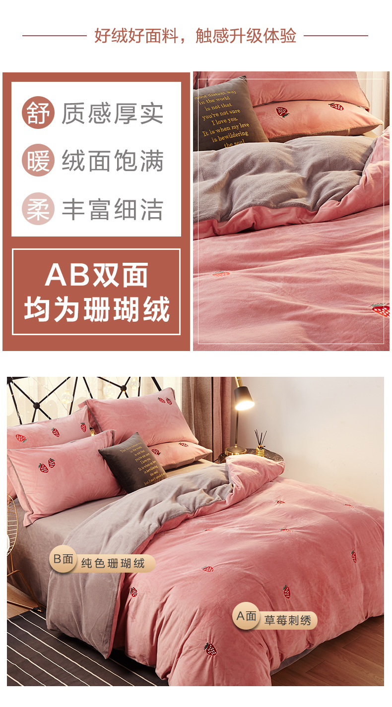 博洋冬季珊瑚绒四件套草莓刺绣加厚法兰绒北欧风被套床上用品水晶