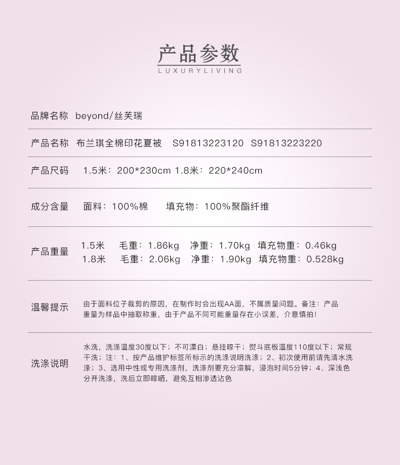 商品名称:博洋夏被纯棉全棉欧式印花空调被夏凉被春秋被子可机洗薄款被芯