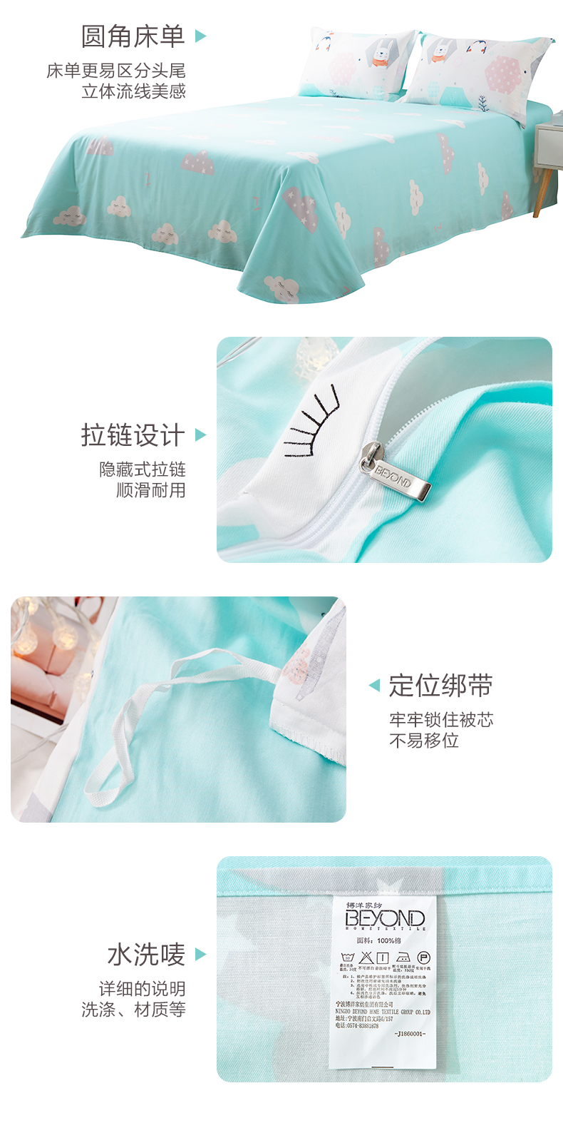 规 格 尺 寸 | 1.2米:被套150*210cm*1 床单200*240cm*1 枕套48*74cm*1 床单为圆角 1.5米:被套200*230cm*1 床单240*240cm*1, 枕套48*74cm*2,床单为圆角 1.8米:被套220*240cm*1 床单260*240cm*1 枕套48*74cm*2,床单为圆角 | |||