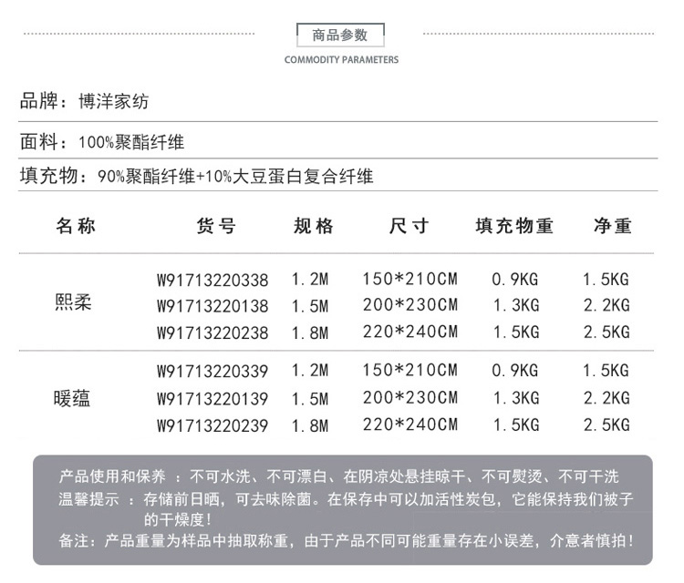 商品名称:博洋春秋被子大豆被纤维被加厚保暖冬季太空被棉被芯冬被秋冬